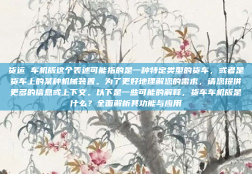 “货车 车机版”这一表述可能指的是一种特定类型的货车,或者是货车上的某种机械装置,由于表述较为模糊,具体含义需要结合上下文或提供更多背景信息才能明确,以下是几种可能的解释:,1. **货车版本**:可能指某种特定配置或功能的货车,例如带有特殊机械装置的货车。,2. **车载机械装置**:可能指货车上安装的某种机械设备,用于辅助货物运输或装卸。,3. **车型配置**:可能指货车的一种特定配置或型号,强调其机械性能或功能特点。,4. **品牌或型号**:可能指某个品牌或系列的货车,具体含义需结合品牌信息进一步确认。,如果您能提供更多上下文或具体描述,可以更准确地解释“货车 车机版”的含义。
