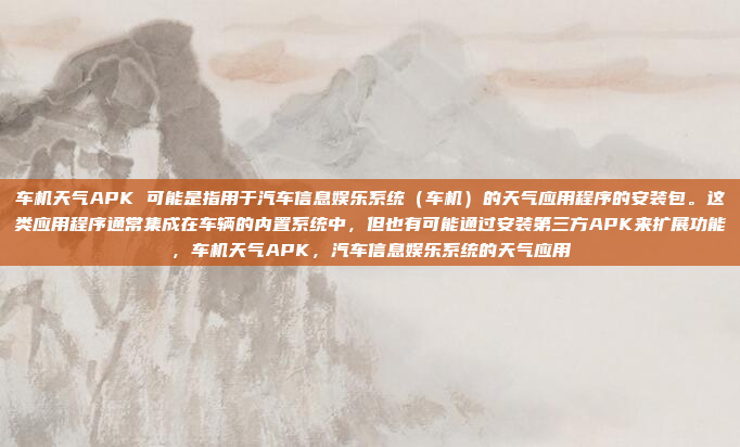 车机天气APK可能是指用于汽车信息娱乐系统(车机)的天气应用程序的安装包,这类应用程序通常集成在车辆的内置系统中,为用户提供实时天气信息,如温度、降水、风速等数据,帮助驾驶员更好地了解天气状况,提升驾驶体验,车机天气APK也可能通过安装第三方应用程序包来扩展功能,为车辆提供更多的天气相关服务,这种应用程序不仅方便了用户的日常驾驶,还可能与其他车载功能联动,进一步优化驾驶环境。