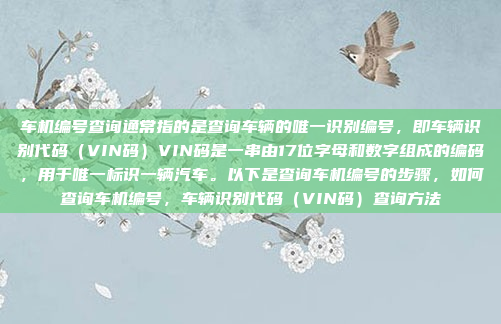 车机编号查询通常指的是查询车辆的唯一识别编号,即车辆识别代码(VIN码),VIN码是一串由17位字母和数字组成的编码,用于唯一标识一辆汽车,以下是查询车机编号的步骤:找到车辆的VIN码,通常位于挡风玻璃下、车门或车辆铭牌上;通过车辆品牌官网、第三方平台或4S店查询VIN码对应的车辆信息,VIN码可以用于查询车辆的历史记录、配置信息等。