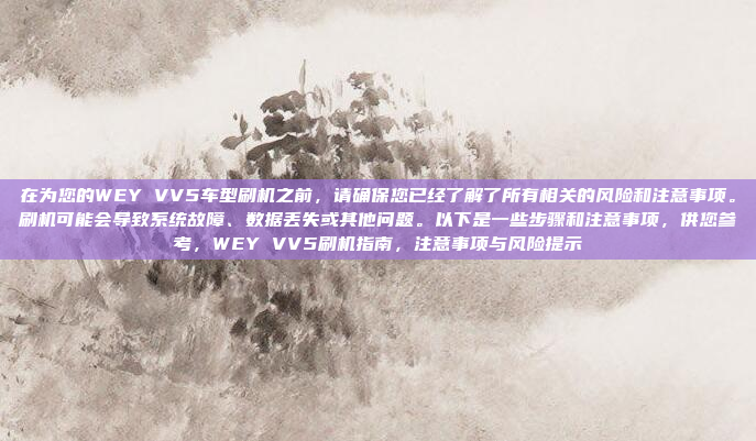 在为WEY VV5车型进行刷机操作之前,建议您充分了解相关风险和注意事项,以避免可能的系统故障、数据丢失或其他问题,刷机操作可能会影响车辆的正常功能,因此在操作前,请确保备份重要数据,使用可靠的工具和正确的刷机方法,刷机后可能需要进行系统校准或其他后续操作,以确保车辆性能正常,如果您对刷机操作不熟悉,建议寻求专业人员的帮助,以避免因误操作导致的意外情况。
