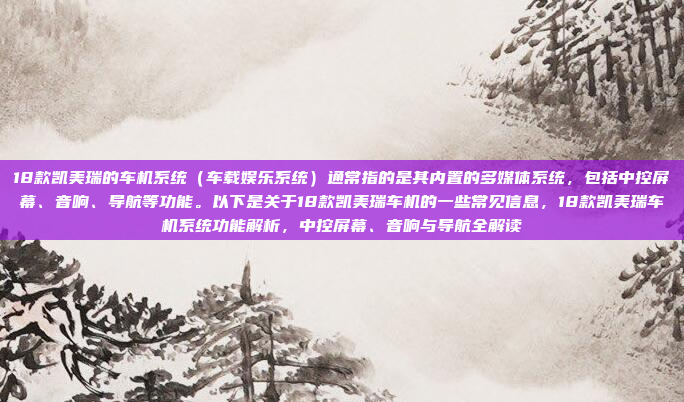 18款凯美瑞的车机系统(车载娱乐系统)是其车内多媒体系统的核心组成部分,主要功能包括中控屏幕操作、音响控制、导航以及多媒体娱乐等,该系统通常配备一块中控触摸屏,支持蓝牙连接、手机互联(如CarPlay和Android Auto)等功能,为驾驶者提供便捷的娱乐和导航体验,车机系统还集成了一定的语音控制功能,进一步提升了驾驶时的操作便利性,部分高配车型可能配备更高级的音响系统,带来更优质的听觉享受,总体而言,18款凯美瑞的车机系统设计简洁实用,操作便捷,能够满足日常驾驶中的多种需求,受到用户的广泛好评。
