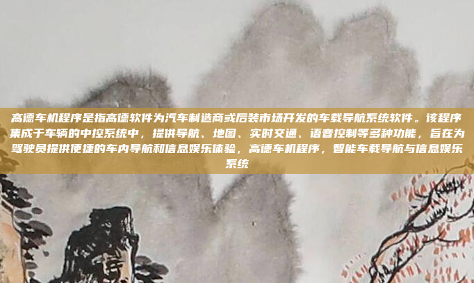 高德车机程序是由高德软件为汽车制造商或后装市场开发的车载导航系统软件,集成于车辆的中控系统中,旨在为驾驶员提供便捷的车内导航和信息娱乐体验,该程序集成了导航、地图、实时交通和语音控制等多种功能,通过智能化的车载系统,帮助用户实现精准的路线规划、实时路况更新以及语音交互操作,从而提升驾驶的便利性和安全性,高德车机程序不仅满足了用户对导航的基本需求,还通过丰富的功能扩展,为驾乘者带来更智能、更高效的信息娱乐体验。