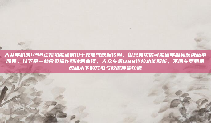 大众车机的USB连接功能主要用于充电和数据传输,但具体功能可能因车型和系统版本的不同而有所差异,常见的操作包括通过USB连接设备(如手机、U盘等)进行充电、文件传输或音乐播放,在使用过程中,建议避免频繁插拔USB设备以防止接口松动,定期检查USB端口的清洁度,以确保连接稳定,传输数据前建议备份重要文件,以防止意外丢失,使用高质量的USB数据线和兼容的设备可以提升连接的稳定性和传输速度,不同车型的车机系统可能存在差异,建议参考车辆的用户手册或咨询4S店以获取更详细的信息。