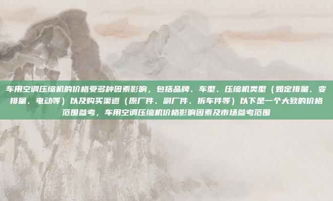 车用空调压缩机的价格受品牌、车型、类型及购买渠道等因素影响,差异较大,品牌方面,原厂件价格通常较高,副厂件和拆车件相对便宜,车型不同也会导致价格波动,豪华车压缩机普遍高于普通车型,压缩机类型如定排量、变排量或电动等,价格从几百元到上万元不等,购买渠道方面,4S店原厂件最贵,汽配城副厂件或二手拆车件价格较低,总体而言,普通车型压缩机价格约在500-3000元,高端车型可能达5000元以上,电动压缩机因技术复杂价格更高,建议根据预算和需求选择合适的类型与渠道。