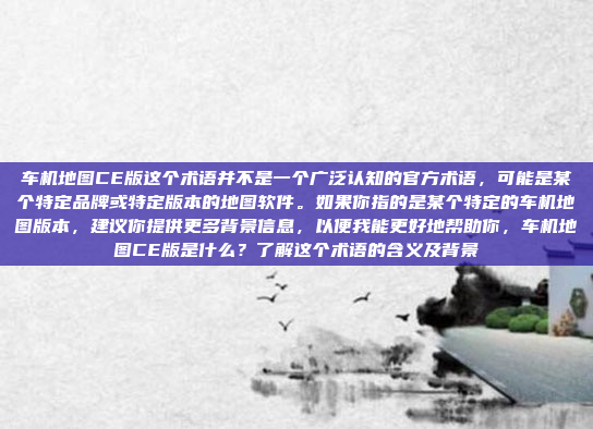 “车机地图CE版”并不是一个广泛认知的官方术语,可能是某个特定品牌或特定版本的地图软件,如果你指的是某个特定的车机地图版本,建议你提供更多背景信息,以便我能更好地帮助你。