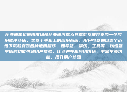 比亚迪车机应用市场是比亚迪汽车为其车载系统开发的一个应用程序商店,类似于手机上的应用商店,用户可以通过这个市场下载和安装各种应用程序,如导航、娱乐、工具等,以增强车辆的功能性和用户体验。