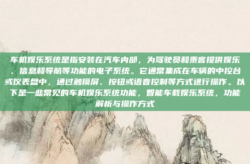 车机娱乐系统是一种集成在汽车内部的电子系统,旨在为驾驶员和乘客提供娱乐、信息和导航等功能,这些系统通常安装在车辆的中控台或仪表盘中,支持通过触摸屏、按钮或语音控制等方式进行操作,常见的功能包括多媒体播放、导航、蓝牙电话连接、车辆信息显示以及语音助手等,车机娱乐系统不仅提升了驾驶体验,还为用户提供了便捷的信息和娱乐服务,成为现代汽车的重要组成部分。