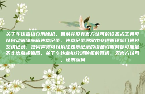 关于车辆违章扣分消除机,目前市场上并不存在官方认可的设备或工具能够自动消除车辆违章记录,违章记录通常由交通管理部门通过系统进行记录和管理,任何声称可以通过设备或服务消除违章记录的信息,很可能是不实宣传或骗局,公众应通过正规渠道处理交通违法问题,避免因轻信虚假信息而遭受损失。