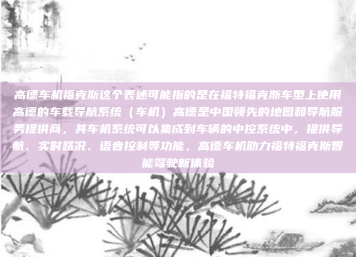 高德车机福克斯可能指的是在福特福克斯车型上搭载了高德的车载导航系统,高德是中国领先的地图和导航服务提供商,其车机系统可以集成到车辆的中控系统中,为驾驶者提供导航、实时路况、语音控制等功能,该系统通过与车辆的中控系统无缝连接,为用户提供了智能化的驾驶体验,帮助用户更轻松地完成导航、信息查询等操作,同时提升了驾驶的安全性和便捷性。