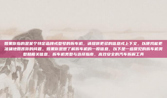如果您有具体的型号或品牌(如“远景”品牌)的拆车机需求,我可以帮助您查找相关的信息或参数,需要注意的是,“远景”品牌确实在汽车拆解设备领域有一定的知名度,如果您能提供更多细节,可以更准确地获取相关信息。
