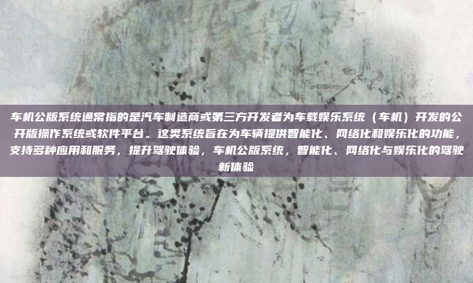车机公版系统是指由汽车制造商或第三方开发者为车载娱乐系统开发的公开版操作系统或软件平台,这类系统旨在为车辆提供智能化、网络化和娱乐化功能,支持多种应用和服务,从而提升驾驶体验,车机公版系统通过整合先进的技术,如智能语音交互、导航、多媒体娱乐和车辆状态监控等,为用户带来更便捷、更丰富的驾乘体验,其开放性设计不仅允许汽车制造商根据需求进行定制,还为第三方开发者提供了开发和优化车载应用的机会,推动了车载娱乐系统的持续创新和升级。
