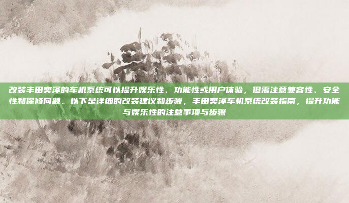 ** ,改装丰田奕泽的车机系统能够显著提升车辆的娱乐性、功能性和用户体验,例如通过升级中控屏幕、安装CarPlay/Android Auto或增加智能语音助手等功能,改装前需注意兼容性,确保新系统与原车硬件匹配;同时要重视安全性,避免影响车辆电路或驾驶辅助系统,自行改装可能导致原厂保修失效,建议咨询4S店或专业技师,操作步骤包括:选择适配的车机型号、备份原系统数据、拆卸旧硬件、安装新系统并测试功能,若缺乏经验,推荐寻求专业改装服务,以平衡性能提升与风险控制。