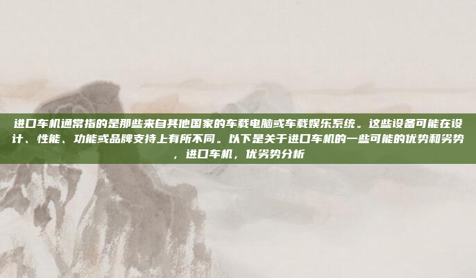 进口车机通常指来自其他国家的车载电脑或娱乐系统,可能在设计、性能、功能或品牌支持上与本地产品有所不同,它们的优势包括高性能、先进功能和丰富的品牌资源,适合追求高品质和创新体验的用户,劣势主要体现在价格昂贵、兼容性问题以及售后服务和维护成本较高,总体而言,进口车机适合对品牌和技术要求较高的用户,而对价格敏感或兼容性有严格需求的用户可能需要谨慎选择。