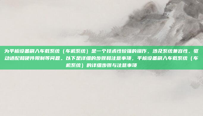 ** ,为平板设备刷入车载系统(车机系统)是一项复杂的技术操作,需考虑系统兼容性、驱动适配及硬件限制等关键因素,首先需确认平板硬件是否支持目标车机系统,并备份原系统数据以防丢失,需解锁Bootloader并刷入兼容的Recovery工具,再通过线刷或卡刷方式安装车机系统包,过程中可能需手动调试驱动或修改系统文件以确保功能正常,操作风险较高,可能导致设备变砖或功能异常,建议仅由具备经验的用户尝试,并严格遵循教程步骤,完成后需测试GPS、蓝牙等车载核心功能是否稳定运行。