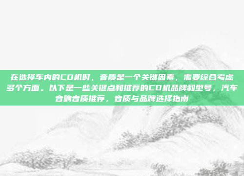 在选择车内的CD机时,音质是关键因素,需综合考虑音质、功放性能、连接方式、便携性和耐用性,推荐高端品牌如JBL和M-Audio,中端选择Audeze和漫步者,入门级可考虑Philips、Sony、JVC、Mouhe等,不同预算的消费者可根据需求选择,高端追求音质与品质,中端注重音效与性价比,入门级则 focus on 基本功能与便携性。